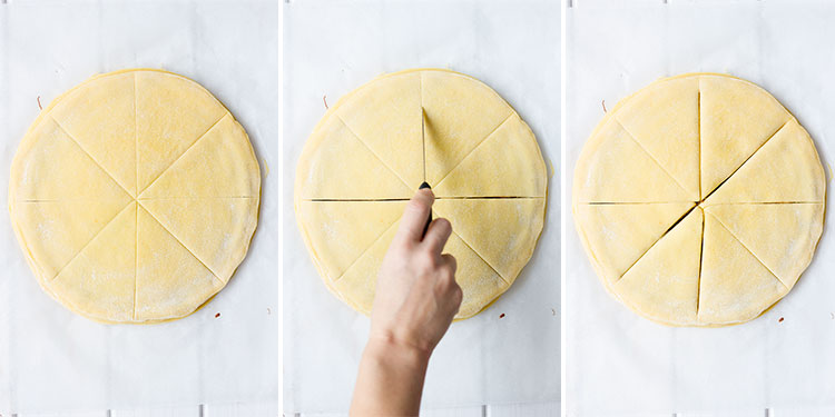 Marcamos, repito, marcamos (¡solo marcar!) con un cuchillo 4 cortes perpendiculares sobre la masa, que darán lugar a 8 triángulos iguales.
