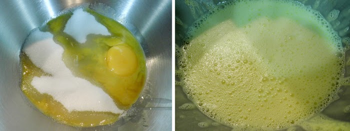 Batimos la yema y el huevo con el azúcar. Una vez bien batido añadimos el aceite y a continuación la leche y seguimos batiendo...