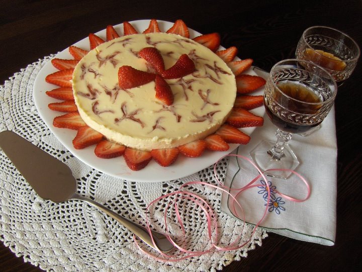 Trituramos las fresas con el azúcar y las ponemos en un cazo al fuego, dejamos hervir unos 8 o 10 minutos hasta que espesen ligeramente. Retiramos del fuego y con ayuda de una cucharilla o de un biberón demos caer gotas sobre el relleno. Con ayuda de un palillo, brocheta o cualquier cosa punzante formamos las espirales. Llevamos la tarta al horno colocando esta en el interior del recipiente con agua. Pasado los primeros 15 minutos bajamos el fuego a 110ºC y dejamos cocer la tarta 75 minutos. Dejamos enfriar por completo en el interior del horno, retiramos, llevamos a la nevera unas cuantas horas, desmoldamos y servimos.