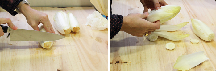 Lavamos bien las endibias bajo el chorro del agua fría, cortamos la parte inferior y eliminamos las hojas exteriores...