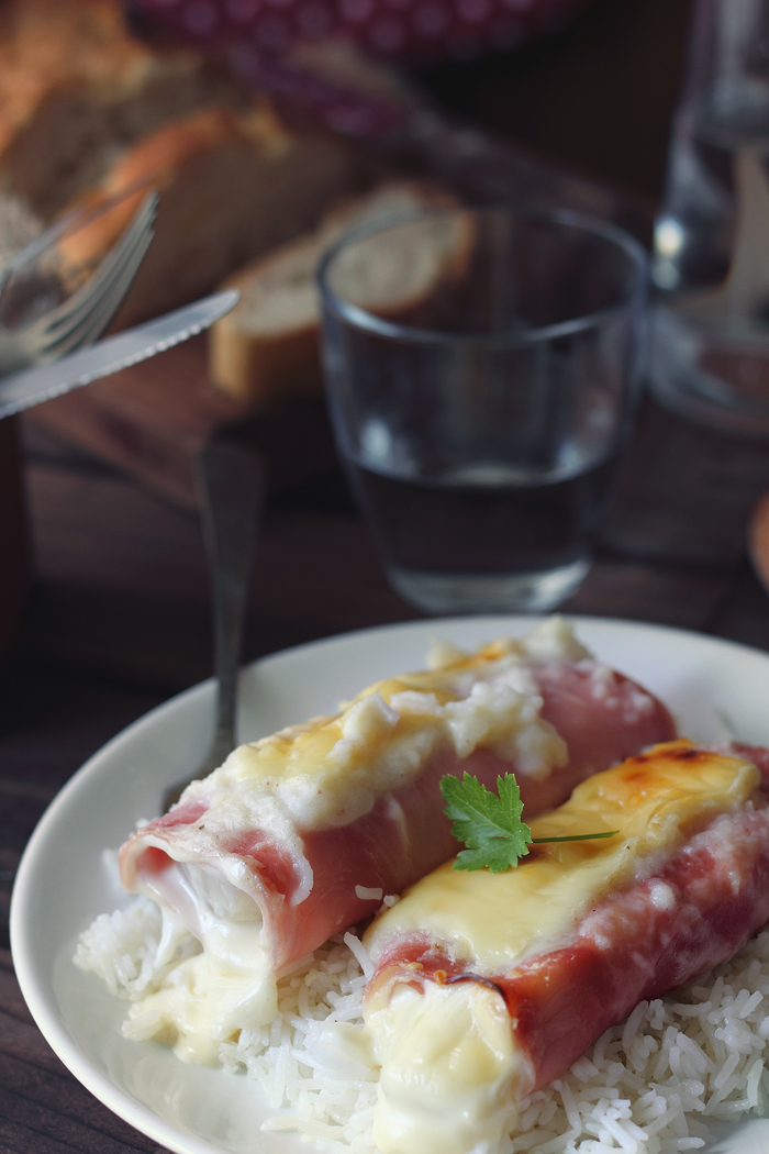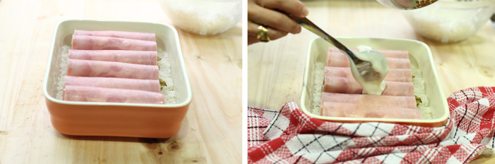 Colocamos una loncha de jamón cocido y encima de este queso y una mitad de endibia...